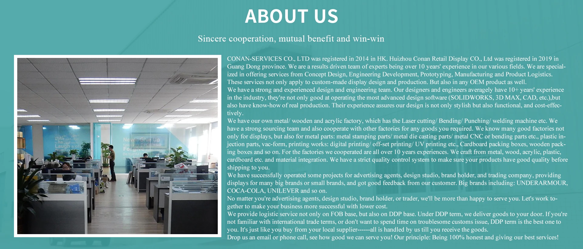 ABOUT US: CONAN-SERVICES CO., LTD was registered in 2014 in HK. Huizhou Conan Retail Display CO., Ltd was registered in 2019 in Guang Dong province. We are a results driven team of experts being over 10 years' experience in our various fields. We are specialized in offering services from Concept Design, Engineering Development, Prototyping, Manufacturing and Product Logistics. These services not only apply to custom-made display design and production. But also in any OEM product as well.